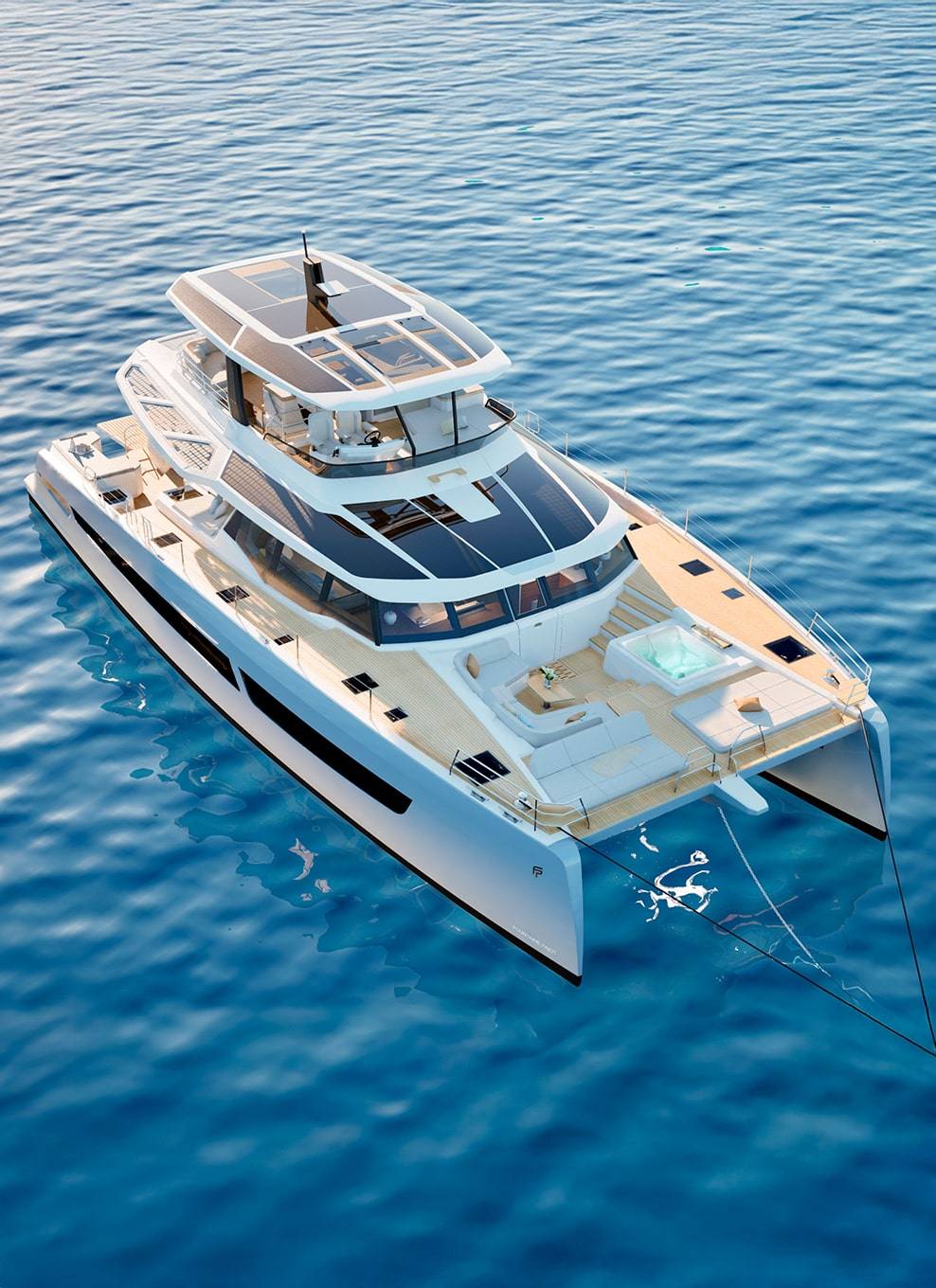 Aboard the FPY70, everything is organised around the rhythm of your lifestyle. Up to eight layout configurations allow you to adjust the balance between privacy and conviviality: the galley open to the saloon or the aft terrace, three to six guest cabins, up to five crew cabins. Noble materials – matt woodwork, mineral textures, soothing tones – create a fluid and timeless atmosphere. Comfort is expressed without interruption: lighting, spa, air conditioning, multimedia, galley… everything works in harmony with pleasure. Fountaine Pajot Yachts is here to support you in creating bespoke finishes that reflect a unique art of living.